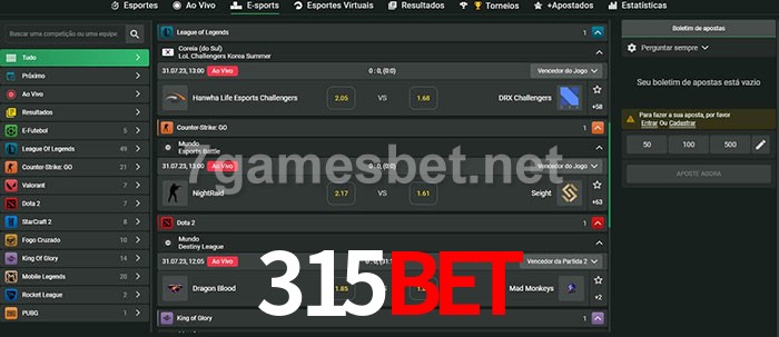 O 315Bet oferece uma grande seleção de opções de apostas em e-sports com probabilidades competitivas